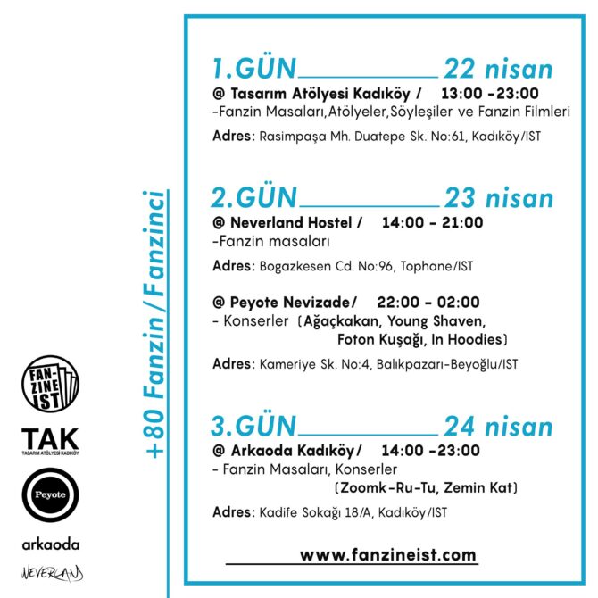 Taking place on venues including Tasarım Atölyesi Kadıköy, Neverland Hostel, Peyote & Arkaoda, the festival will host fanzine tables as well as talks, film screenings and concerts.