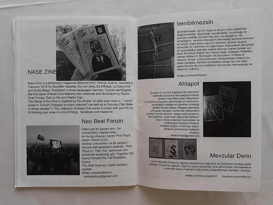 Industrias Doc (ES), a…issue (Nomadic), Torchon (CH), Counterspaces(IN/TR), Word-o-Mat (S), Māo Pào (GR), Nase Zine (AT), The Untitled Box Collection (IT), Father Zine(BR), South East Drift (GB), Buttcheeks Breadcumbs and Bedbugs (GB), Blood Becomes Water (BG), Heyt be! Fanzin, Banliyö. Fanzin, Mezzazine, Sigara Çakmak Fanzin, Böcek Fanzin, Adios Fanzin, Ihlamur Akşamı, Öteberi, Mommo Fanzin, Karakedi Fanzin, Void Zine, Siyah Safra, Piyon Fanzin, Kıtlama Fanzin, MSGSÜ İllüstrasyon Fanzin, Carbon Zine, Arabesk Fanzin, Zift, Sığınak Fanzin, Çizgi Fanzin, Santigrad 100, Mevzular Derin Fanzin, Pornavida, Arhat Fanzin, Kambur Fanzin, KYNIK, little black book, isimsiz fanzin, kivizine, Neo Beat Fanzin, Sendrom, Palyaço Fanzin, benibilmezsin, Gece Uyuyamayanlar, Heyula Fanzin, FAK Fanzin, Av’ın hikayesi, Tuğla, DER, Münteha, Gulyabani Günlüğü, Duende, Benzin Fanzin, bohça fanzin, Ahtapot, Vertigo, Zifir, Ekmek Arası, Kenarlar [mimarlık fanzinleri seti], TYPO-BAK, Üretim Bandı, DEM, Solbek, İçerik, ne fanzin, Flaneur Fanzines, Sentetik Şehir Fanzin, Write drunk edit sober, Şermin’in intikamı, Merkez Arkası, FOMO, Hawaii, Fantezin, minimalist, ÜNderground, Tavuskuşu Fanzin, Gözaltı, Bazen, Hallo, Gelişim Haşat, Bahçıvan, Transmission Live! Zine, Sıvadık Fanzin, İkaros Fanzin, A mısın? P misin?, Zoomk-Ru-Tu