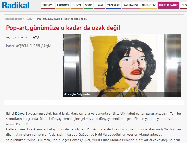 ”The ‘Pop Art Extended’ exhibition, prepared in collaboration with Gallery Lineart and Alanistanbul, features works inspired by pop-art superstar Andy Warhol. While the works of Arda Yalkın, Ayşegül Sağbaş and Halil Vurucuoğlu are exhibited in Alanistanbul, the works of Ayline Olukman, Deniz Beser, Gökçe Çelikel, Murat Pulat, Monika Bulanda, Yiğit Yazıcı and Zeynep Beler are showcased at Gallery Lineart…”